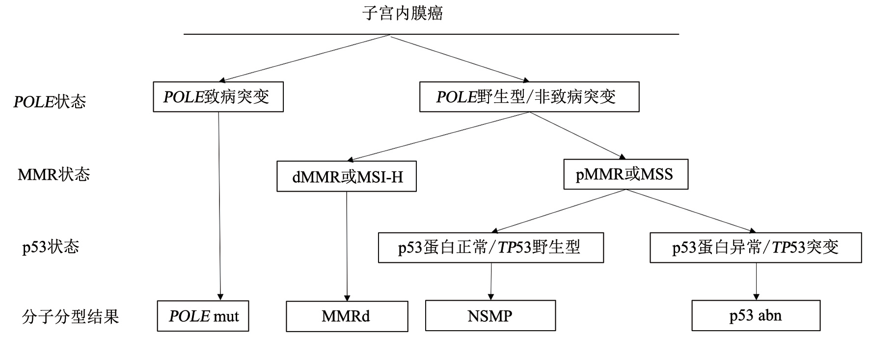 2013年美國癌癥基因組圖譜(TCGA),依據子宮內膜癌全基因組、轉錄組、蛋白組等多組學檢測結果,將其分為POLE突變型、微衛(wèi)星不穩(wěn)定突變型、低拷貝數型和高拷貝數型等4種類型。2023年國際婦產科聯盟(International Federation of Gynecology and Obstetrics,FIGO)分期建議,所有的子宮內膜癌EC患者均應完善分子分型檢測。