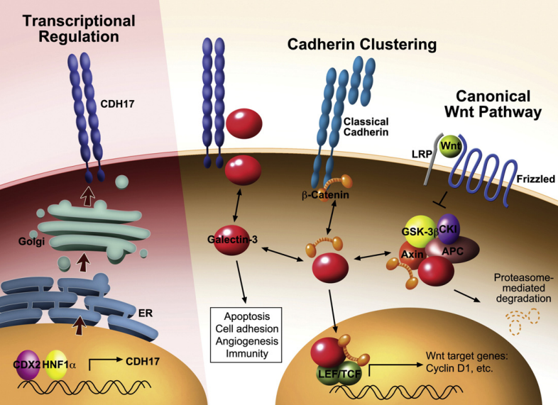 CDH17(Cadherin 17,LI-cadherin)序列由七個(gè)細(xì)胞外的鈣粘蛋白結(jié)構(gòu)域和一個(gè)非常短的細(xì)胞質(zhì)結(jié)構(gòu)域形成。與其他經(jīng)典的鈣粘蛋白不同,CDH17是一種鈣依賴性跨膜糖蛋白,可介導(dǎo)細(xì)胞在腸上皮中的細(xì)胞粘附。